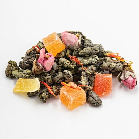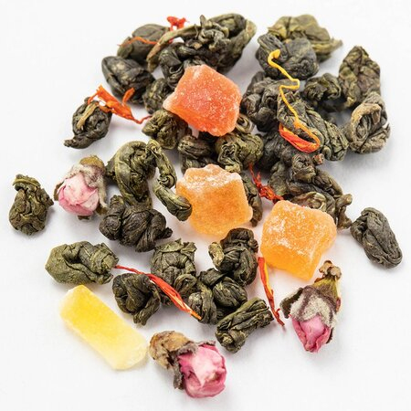 Чай зеленый китайский, папайя кусочки, персик бутоны, сафлор лепестки, аромат сочного персика