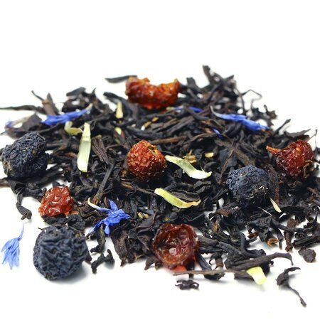 Чай черный индийский, плоды черноплодной рябины, плоды шиповника измельченные, лепестки василька, аромат сливочного бергамота.
