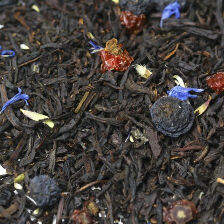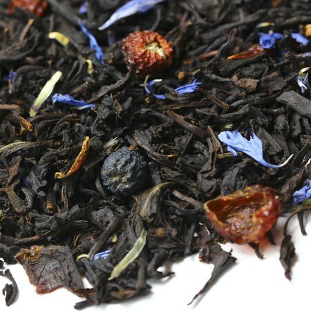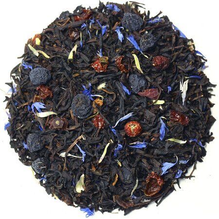 Простая, но утонченная композиция составлена из черного индийского чая, плодов черноплодной рябины и измельченных плодов шиповника, приправлена легкой россыпью лепестков василька и напоена ароматом бергамота.