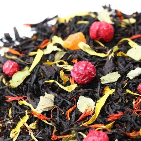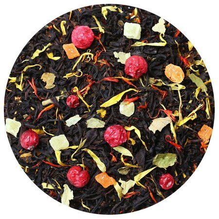 Оригинальное цветовое сочетание черного чая, желтых кубиков ананаса и красных бусин ягод с желто-оранжевыми лепестками и вкраплениями зеленого листа оправдывает название.
