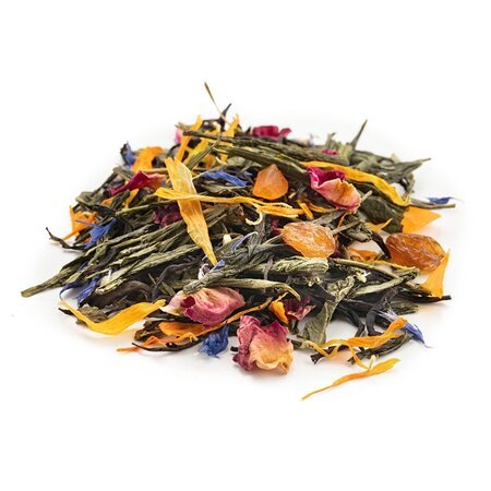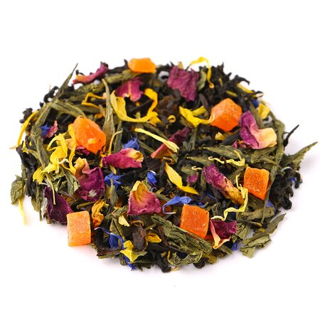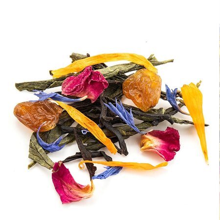 Завораживающий тандем черного и зеленого чаев разбавлен кусочками ананаса и красным изюмом, дополнен лепестками красной розы, синего василька и календулы.