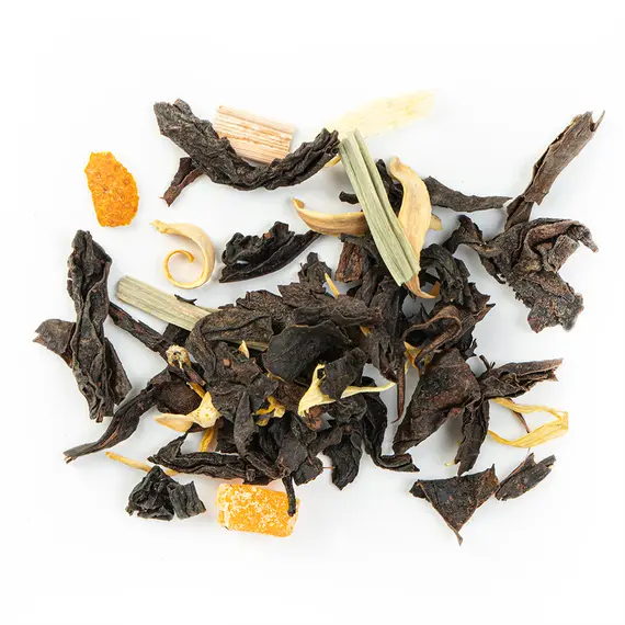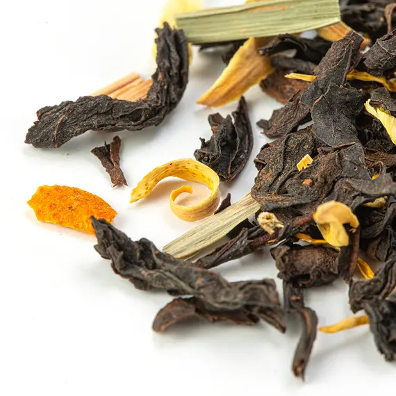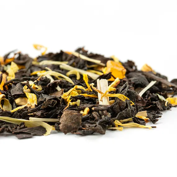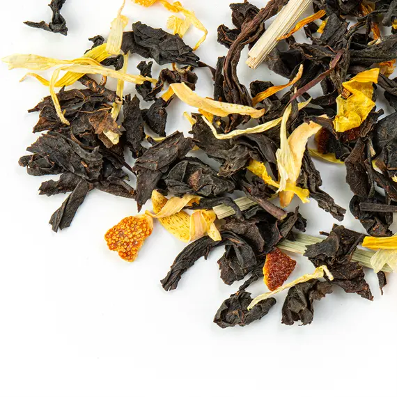 Состав: чай черный, цукаты ананаса, цедра апельсина, лимонная трава, лепестки календулы, цветки апельсина, аромат сладкого апельсина
